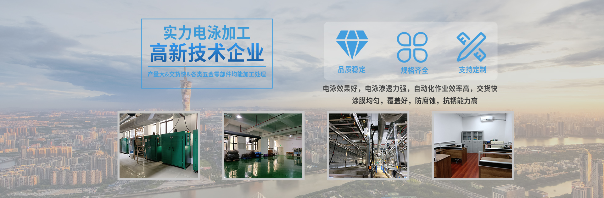 本公司創(chuàng)始于2004年,由專(zhuān)業(yè)的涂料技術(shù)專(zhuān)家及應(yīng)用技術(shù)工程師發(fā)起并組建的高新技術(shù)企業(yè),專(zhuān)業(yè)從事各類(lèi)金屬電泳涂裝,是專(zhuān)業(yè)的電泳涂料、電泳加工及配套設(shè)備供應(yīng)的高科技公司。 本公司依托多年從事電泳的經(jīng)驗(yàn)技術(shù),對(duì)多種材料(銅、鋁、鐵、不銹鋼、鋅合金、鋁合金等材料)表面處理的研究,采用先進(jìn)的工藝與進(jìn)口原料的配合,完全可以保證客戶產(chǎn)品的表面涂裝,能達(dá)到出口產(chǎn)品的標(biāo)準(zhǔn)要求。主要電泳白色、透明、黑色和紅色、藍(lán)色、黃色、紫色等多種彩色。 憑著先進(jìn)的電泳技術(shù)和嚴(yán)格的品質(zhì)要求,本著以最高的客戶滿意度為目標(biāo),這幾年時(shí)間,我們已得到了精密電子五金、衛(wèi)...